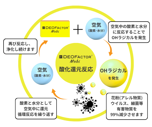 DEOFACTORは成分の天然ミネラルが空気中の酸素と水分と反応し、OHラジカルと呼ばれる分子を生成します。OHラジカルの酸化還元反応によって、ニオイやウイルス、細菌、カビ、アレル物質などの有害物質を減少させます。消臭剤や脱臭剤のように高い即効性はございませんが、空気さえあれば24時間、365日黙々と効果を発揮し続けます。