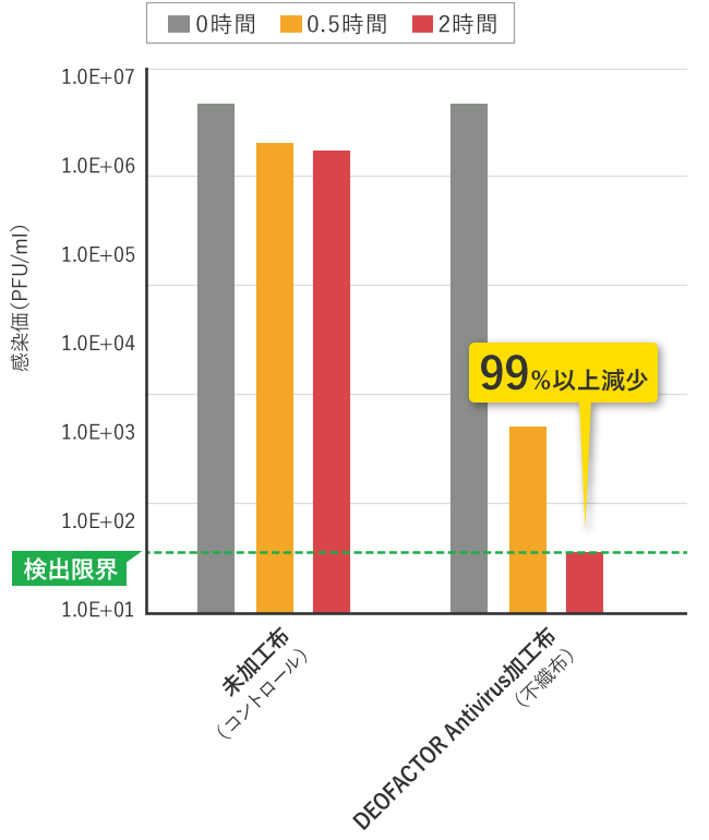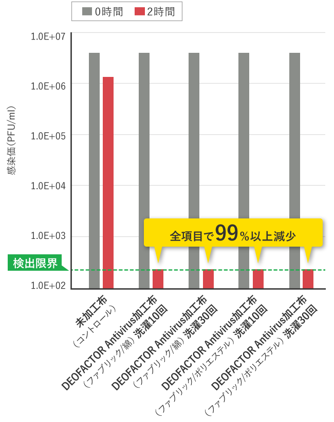 検出限界以下の99%以上ウイルスが減少することが明らかとなりました。